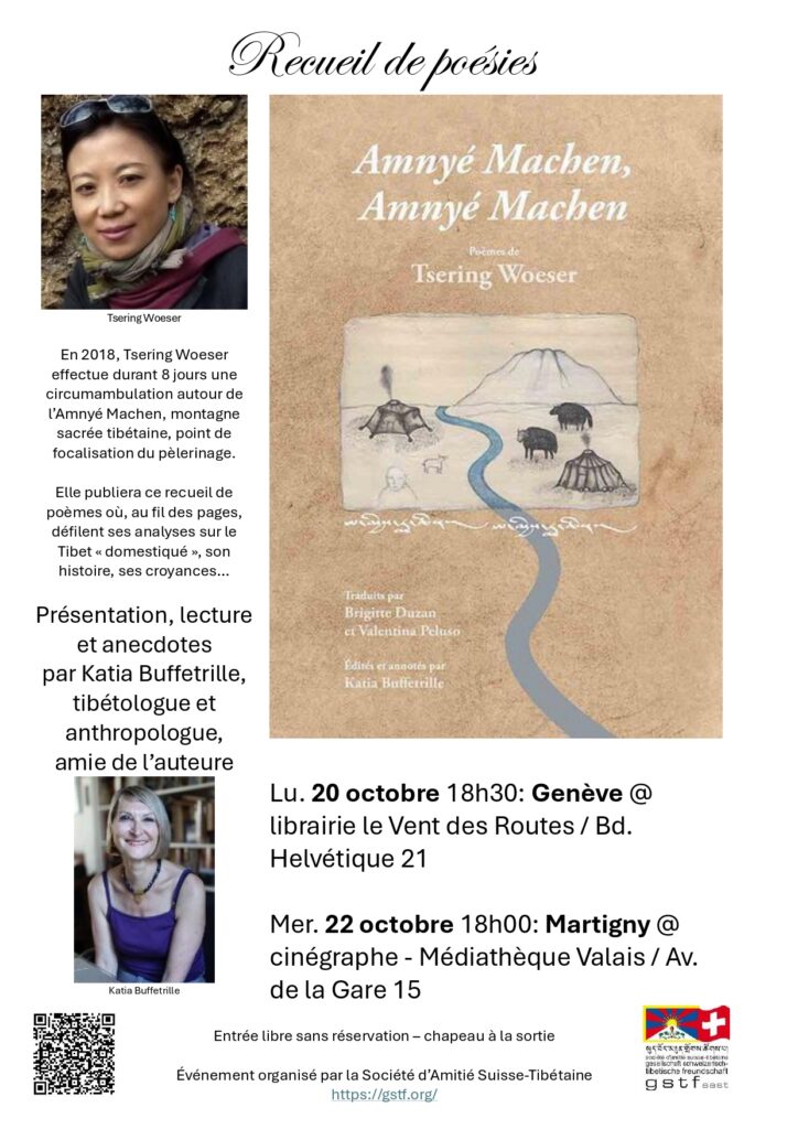 Présentation de l’ouvrage Amnyé Machen, Amnyé Machen: en 2018, accompagnée de Katia Buffetrille, tibétologue et anthropologue française, Tsering Woeser effectue une circumambulation de 8 jours autour de l’Amnyé Machen, montagne sacrée tibétaine. De ce pèlerinage, en 2023, elle publie le recueil objet de la présentation, où s’expriment, sous forme de poèmes, ses analyses sur le Tibet « domestiqué », son histoire, ses croyances. L’édition française parue chez Jentayu et traduite par Brigitte Duzan, spécialiste de littérature chinoise contemporaine, et Valentina Peluso, Docteure en littérature ayant consacré son travail de recherche à l’œuvre de Tsering Woeser, est illustrée d’une centaine de photographies prises par l’auteure et l’anthropologue.