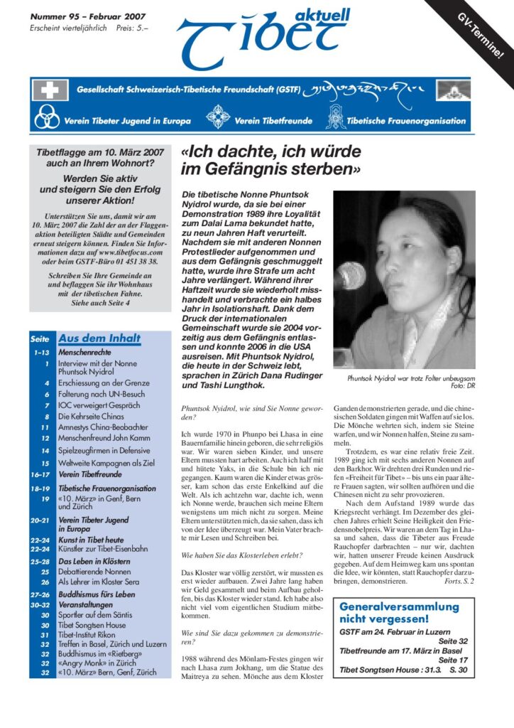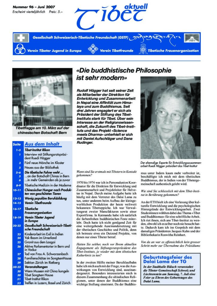 96 • Juni 2007 Die buddhistische Philosophie ist sehr modern 95 • Februar 2007 Ich dachte, ich würde im Gefängnis sterben 94 • November 2006 Erst gemeinsam können wir viel bewirken! 93 • September 2006 Kelsang Gyaltsen mahnt zu Geduld bei den Gesprächen mit China 92 • Mai 2006 Der Dalai Lama ist wie eine Wiedergeburt des Franz von Assisi 91 • Januar 2006 Diskriminierung als Nonne habe ich selbst erlebt 90 • November 2005 Zwölftägiger Marathon Seiner Heiligkeit in Zürich 89 • August 2005 Der Dalai Lama in Zürich 88 • April 2005 Etwas von der Fröhlichkeit und vom inneren Frieden des Dalai Lama mitnehmen 87 • Januar 2005 Spricht eine Generation nicht mehr Tibetisch, ist unsere Identität verloren 86 • November 2004 Schliesslich überlebt nur das Spirituelle 85 • August 2004 Die Tibeter wurden fürstlich empfangen « 1 2 … 4 5 6 7 8 »