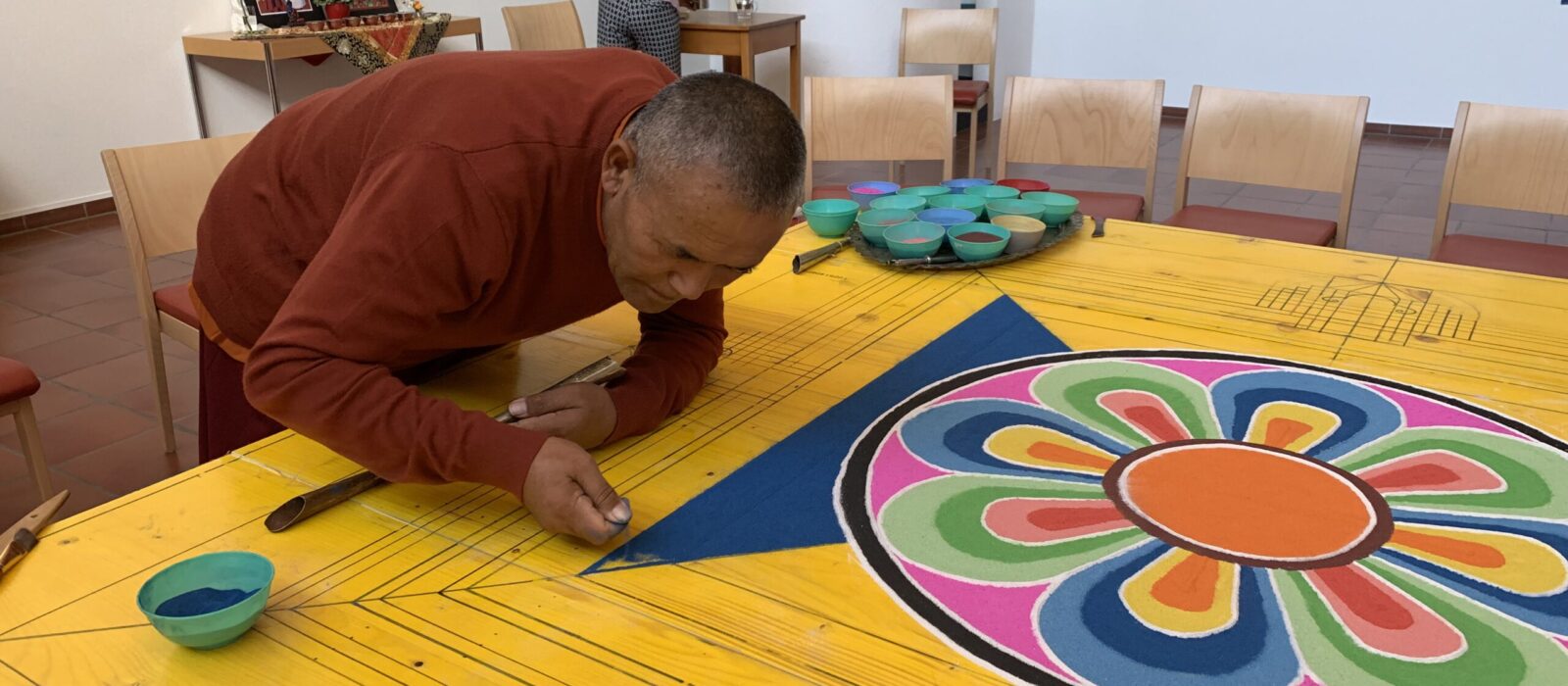Abt Khenpo Kungka Tenzin wird im Januar und Februar 2026 gemeinsam mit seinem Begleiter Lama Nawang Funchok in der Schweiz und in Deutschland kunstvolle Medizin-Buddha-Mandala anfertigen. Diese Werke entstehen an mehreren Orten und dienen der Sammlung von Spenden zugunsten des Klosters in Mustang (Nepal).