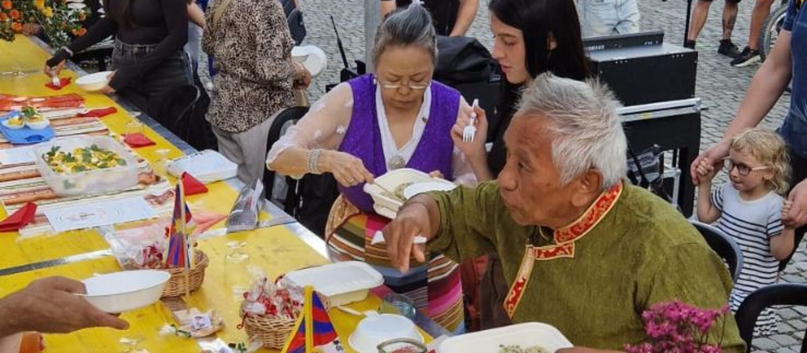 Tavolata auf dem Münsterhof der Stadt Zürich – mittendrin die Gesellschaft Schweizerisch-Tibetische Freundschaft (GSTF) mit ihrem Beitrag «Vegane Momos» und dem speziellen tibetischen «Khabse»-Gebäck